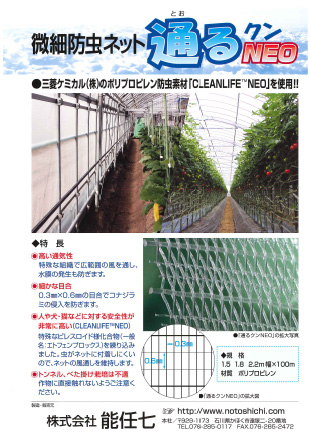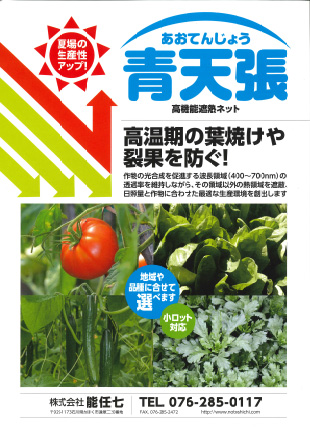 防虫ネット、防風ネット、防鳥ネット、防獣ネット、保温用シート、反射シート、防草シート、クロスシート、堆肥発酵促進シート、防根透水シート、シート押え、遮光剤、電撃殺虫機、捕虫器、防蛾灯、防鳥テープ・糸、粘着捕虫テープ、電柵、貯水タンク、塩ビパイプ、ポリパイプ、灌水ノズル、スプリンクラー、暗渠パイプ、軟質ホース、給水・循環ポンプ、液肥混入器、ろ過器、樹脂被覆鋼管、FRP支柱、樹脂被覆鉄線、鋼線、樹脂線、ポリダクト、フルーツキャップ、果実袋、保冷庫、保管庫、育苗箱、育苗マット、ポリ鉢、プランター、プラグトレー、温床線、アゼ板、アゼ波、ハウスカー、作業イス、計測器、接木資材、誘引資材、誘引結束機、電照資材、除雪用品、農業用高所作業車、アシストスーツ 他